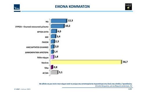 Στην ερώτηση ποιο κόμμα ανταποκρίνεται καλύτερα στις προσδοκίες σας, το 56,7% των πολιτών απαντά κανένα κόμμα. Το 12,3% απαντά η ΝΔ, ενώ το 10,2% απαντά το ΣΥΡΙΖΑ.