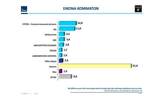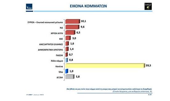 Συγκεκριμένα στην εκτίμηση της εκλογικής επιρροής ο ΣΥΡΙΖΑ έρχεται πρώτο κόμμα με ποσοστό 29%. Δεύτερη ακολουθεί η ΝΔ με 26,5% ενώ τρίτο κόμμα είναι η Χρυσή Αυγή με ποσοστό 14%.