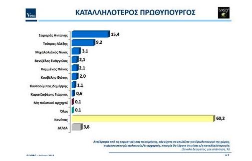 Καταλληλότερος πρωθυπουργός παραμένει ο «κανένας» λαμβάνοντας το συντριπτικό ποσοστό 60,2%. Ο Πρωθυπουργός Αντώνης Σαμαράς λαμβάνει ποσοστό καταλληλότητας 15,4% ενώ ο πρόεδρος του ΣΥΡΙΖΑ, Αλέξης Τσίπρας λαμβάνει 9,2%.