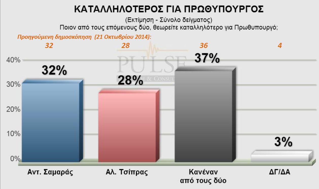 Καταλληλότερος πρωθυπουργός αναδεικνύεται ο Αντώνης Σαμαράς με 32% έναντι 28% του Αλέξη Τσίπρα, ενώ η πλειοψηφία λέει όχι σε πρόωρες εκλογές.