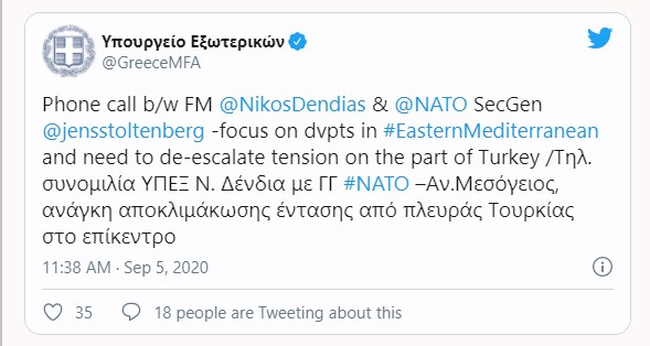 Τηλεφωνική συνομιλία με τον Γενικό Γραμματέα του ΝΑΤΟ Γενς Στόλτενμπεργκ πραγματοποίησε νωρίτερα σήμερα ο υπουργός Εξωτερικών Νίκος Δένδιας. Στο επίκεντρο της συνομιλίας βρέθηκαν οι εξελίξεις στην Ανατολική Μεσόγειο και η ανάγκη αποκλιμάκωσης της έντασης από πλευράς της Τουρκίας, σύμφωνα με σχετική ανάρτηση του υπουργείου Εξωτερικών στο twitter.
