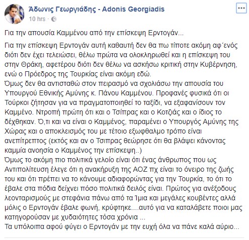 Ο αντιπρόεδρος της Νέας Δημοκρατίας, Άδωνις Γεωργιάδης, χαρακτήρισε ανεπίτρεπτο τον αποκλεισμό του Προέδρου των Ανεξάρτητων Ελλήνων και Υπουργού Εθνικής Άμυνας, Πάνου Καμμένου, από την επίσκεψη του Τούρκου Προέδρου στην Ελλάδα.