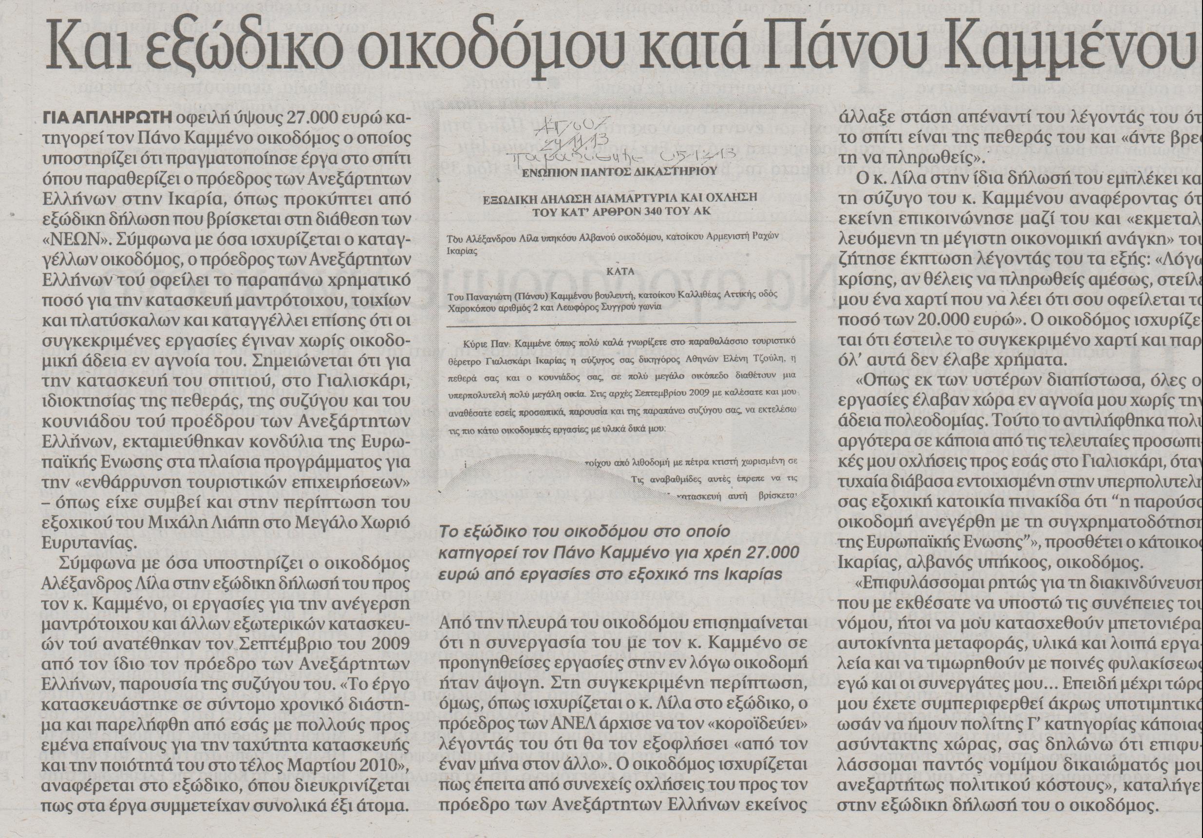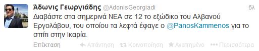 Μέσω του προσωπικού του λογαριασμού στο twitter, ο κ. Γεωργιάδης “διαφημίζει” άρθρο στην εφημερίδα ΤΑ ΝΕΑ στο οποίο δημοσιεύεται εξώδικο οικοδόμου κατά του κ. Καμμένου για οφειλή ύψους 27 χιλιάδων ευρώ.