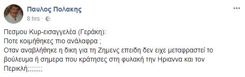 Νέα επίθεση στη Δικαιοσύνη εξαπέλυσε ο αναπληρωτής υπουργός Υγείας Παύλος Πολάκης μετά την απόρριψη του αιτήματος για αναστολή εκτέλεσης της ποινής της Ηριάννας Β.Λ και του Περικλή Μ. από το πενταμελές Εφετείο αναστολών.