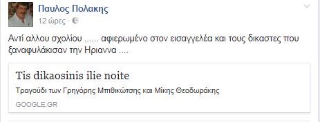 Νωρίτερα ο αναπληρωτής υπουργός Υγείας αφιέρωσε σε εισαγγελέα και δικαστές το τραγούδι «Της Δικαιοσύνης Ήλιε Νοητέ»«Αντί άλλου σχολίου …… αφιερωμένο στον εισαγγελέα και τους δικαστές που ξαναφυλάκισαν την Ηριάννα ….» έγραψε.