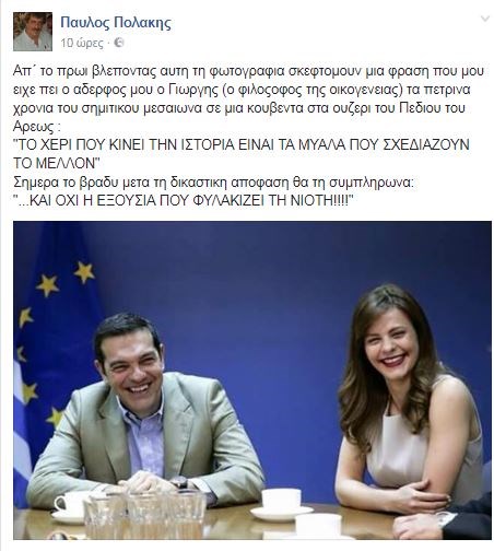 Αναφερόμενος στην επίσκεψη του πρωθυπουργού στο υπ. Εργασίας, γράφει «το χέρι που κινεί την ιστορία είναι τα μυαλά που σχεδιάζουν το μέλλον». Μάλιστα συνοδεύει την ανάρτησή του με μια φωτογραφία του Αλέξη Τσίπρα με την Έφη Αχτσιόγλου. Ο αναπληρωτής υπουργός Υγείας όμως συνεχίζει την φράση, γράφοντας αναφερόμενος στην υπόθεση της Ηριαννας