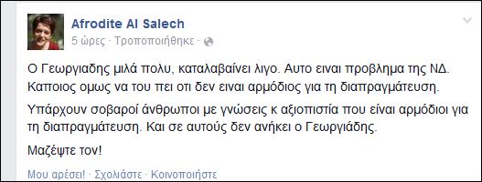 Πυρά κατά του Άδωνι Γεωργιάδη εξαπέλυσε για άλλη μια φορά η Αφροδίτη Αλ Σάλεχ με ανάρτησή της στην προσωπική της σελίδα στο Facebook.