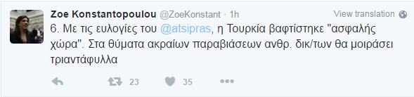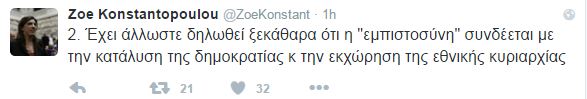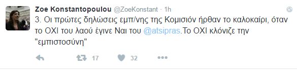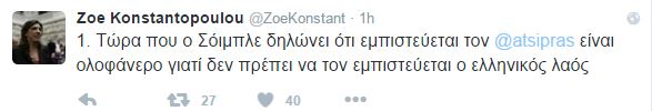 «Τώρα που ο Σόιμπλε δηλώνει ότι εμπιστεύεται τον Αλέξη Τσίπρα είναι ολοφάνερο γιατί δεν πρέπει να τον εμπιστεύεται ο ελληνικός λαός» έγραψε στο Twitter η πρώην πρόεδρος της Βουλής, Ζωή Κωνσταντοπούλου.