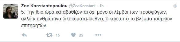 «Την ίδια ώρα, καταβυθίζονται όχι μόνο οι λέμβοι των προσφύγων, αλλά και ανθρώπινα δικαιώματα-διεθνές δίκαιο, υπό το βλέμμα Τούρκων επιτηρητών. Με τις ευλογίες του Τσίπρα, η Τουρκία βαφτίστηκε “ασφαλής χώρα”. Στα θύματα ακραίων παραβιάσεων ανθρωπίνων δικαιωμάτων θα μοιράσει τριαντάφυλλα».