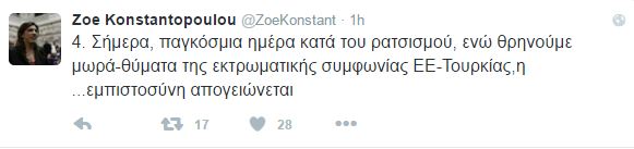 «Έχει άλλωστε δηλωθεί ξεκάθαρα ότι η “εμπιστοσύνη” συνδέεται με την κατάλυση της δημοκρατίας και την εκχώρηση της εθνικής κυριαρχίας. Οι πρώτες δηλώσεις εμπιστοσύνης της Κομισιόν ήρθαν το καλοκαίρι, όταν το ΟΧΙ του λαού έγινε Ναι του Τσίπρα. Το ΟΧΙ κλόνιζε την “εμπιστοσύνη”. Σήμερα, παγκόσμια ημέρα κατά του ρατσισμού, ενώ θρηνούμε μωρά-θύματα της εκτρωματικής συμφωνίας ΕΕ-Τουρκίας, η …εμπιστοσύνη απογειώνεται», συνέχισε.