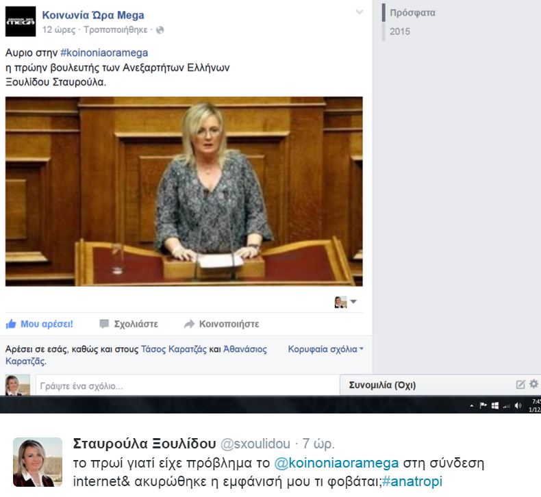 «Το πρωί γιατί είχε πρόβλημα το @koinoniaoramega στη σύνδεση internet& ακυρώθηκε η εμφάνισή μου τι φοβάται; #anatropi» έγραψε η Σταυρούλα Ξουλίδου στον προσωπικό της λογαριασμό στο twitter.