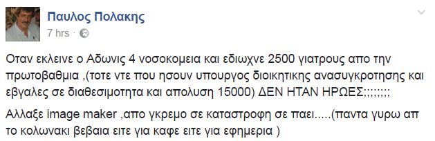 «Όταν έκλεινε ο Άδωνις 4 νοσοκομεία και έδιωχνε 2500 γιατρούς από την πρωτοβάθμια, (τότε ντε που ήσουν υπουργός διοικητικής ανασυγκρότησης και έβγαλες σε διαθεσιμότητα και απόλυση 15000) δεν ήταν ήρωες;
