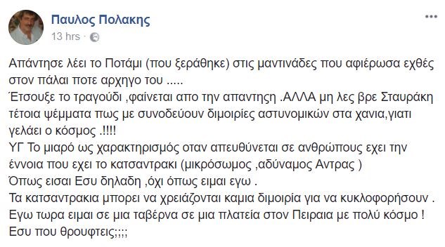 “Απάντησε λέει το Ποτάμι (που ξεράθηκε) στις μαντινάδες που αφιέρωσα εχθές στον πάλαι πότε αρχηγό του… Έτσουξε το τραγούδι, φαίνεται από την απάντηση. Αλλά μη λες βρε Σταυράκη τέτοια ψέματα πως με συνοδεύουν διμοιρίες αστυνομικών στα Χανιά, γιατί γελάει ο κόσμος!