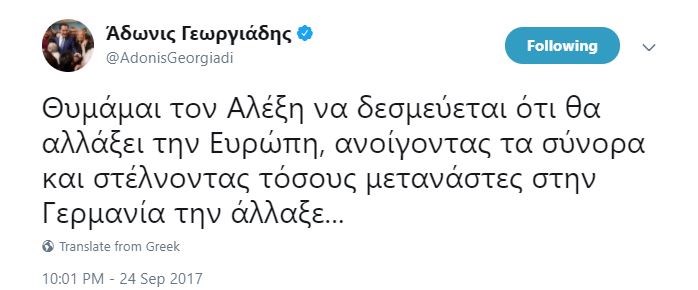 “Θυμάμαι τον Αλέξη να δεσμεύεται ότι θα αλλάξει την Ευρώπη, ανοίγοντας τα σύνορα και στέλνοντας τόσους μετανάστες στην Γερμανία την άλλαξε…” έγραψε ο Άδωνις Γεωργιάδης στον λογαριασμό του στο twitter.