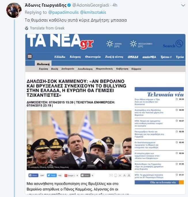 Νέα κόντρα μέσω twitter είχαν o ευρωβουλευτής του ΣΥΡΙΖΑ και αντιπρόεδρος του Ευρωπαϊκού Κοινοβουλίου, Δημήτρης Παπαδημούλης και ο αντιπρόεδρος της ΝΔ, Άδωνις Γεωργιάδης, με αφορμή τα αποτελέσματα των γερμανικών εκλογών.