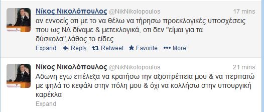 “Φυσικά δεν εννοώ κάτι για συναδέλφους.Όταν η πολιτική της ΝΔ άλλαξε μετεκλογικά προτίμησα να φύγω παρά να είμαι ανακόλουθος”, έγραψε λίγο μετά ο κ. Νικολόπουλος.
