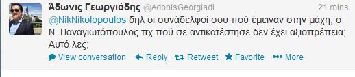 “Δηλαδή οι συνάδελφοί σου πού έμειναν στην μάχη, ο Ν. Παναγιωτόπουλος πχ πού σε αντικατέστησε δεν έχει αξιοπρέπεια; Αυτό λες;”, ανταπάντησε ο κ. Γεωργιάδης.