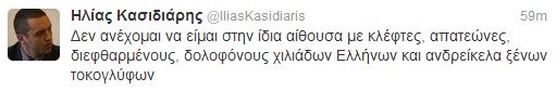 Με ένα προκλητικό κείμενο στον προσωπικό του λογαριασμό του twitter, ο βουλευτής της Χρυσής Αυγής Ηλίας Κασιδιάρης φέρεται να απαντάει στον βουλευτή της Νέας Δημοκρατίας Ανδρέα Ψυχάρη και στα πρωινά λεγόμενά του στη Βουλή.