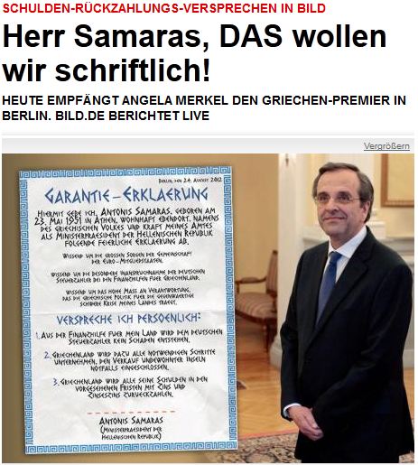 Λίγες ώρες πριν ο Αντώνης Σαμαράς βρεθεί τετ α τετ με την Άνκελα Μέρκελ, η γερμανική εφημερίδα Bild μένει πιστή στις προκλήσεις της!Δημιούργησαν ένα έγγραφο-εγγύηση και ζητούν από τον Έλληνα πρωθυπουργό να το υπογράψει.«Κύριε Σαμαρά το θέλουμε υπογεγραμμένο», είναι ο τίτλος του άρθρου και αναφέρεται στην προσωπική υπόσχεση και εγγύηση που έδωσε ο κ.Σαμαράς σε συνεντεύξεις του σε γερμανικά και γαλλικά ΜΜΕ.