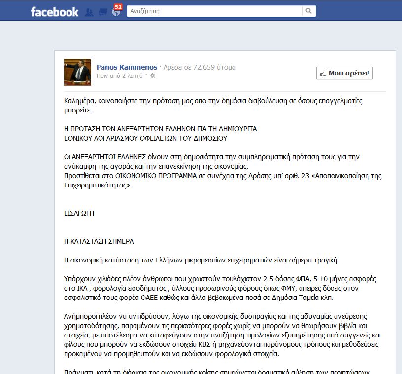 Η πρόταση αυτή των ΑΝΕΞΑΡΤΗΤΩΝ ΕΛΛΗΝΩΝ είναι προϊόν της δημόσιας διαβούλευσης με τον επιχειρηματικό κόσμο της χώρας και αφορά ένα πλήθος τουλάχιστον 2.000.000 Ελλήνων μικρομεσαίων επιχειρηματιών, ενεργών και μη.”
