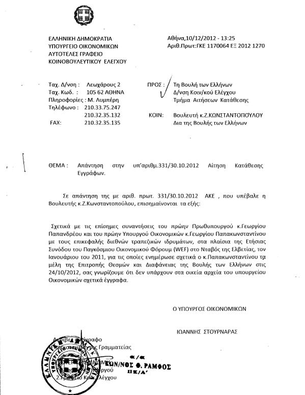 «Δεν υπάρχουν στα οικεία αρχεία του Υπουργείου Οικονομικών» έγγραφα σχετικά με τις συναντήσεις του τότε Πρωθυπουργού Γιώργου Παπανδρέου και του τότε Υπουργού Οικονομικών Γιώργου Παπακωνσταντίνου με τους επικεφαλής διεθνών τραπεζικών ιδρυμάτων, μεταξύ των οποίων της HSBC και της UBS τον Ιανουάριο 2012.