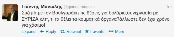 “Συζητά με τον Βουλγαράκη τις θέσεις για δολάριο, συνεργασία με ΣΥΡΙΖΑ κλπ, τι τα θέλει τα κομματικά όργανα; Άλλωστε δεν έχει χρόνο για χάσιμο!”, έγραψε στο twitter ο Γιάννης Μανώλης.