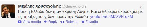 Νέα επίθεση στην Χρυσή Αυγή εξαπέλυσε μέσω Twitter o Mιχάλης Χρυσοχοΐδης.”Ποτέ η Ελλάδα δεν ήταν «Χρυσή Αυγή». Και οι θλιβεροί ακροδεξιοί με τις πράξεις τους δεν τιμούν την Ελλάδα”, έγραψε ο κοινοβουλευτικός εκπρόσωπος του ΠΑΣΟΚ, επισυνάπτωντας την ομιλία του στην βουλή πριν από μερικές ημέρες όταν κατηγόρησε την Χρυσή Αυγή ότι “στοχοποιεί τη χώρα” και είπε ότι ρόλος της είναι επιζημιος.