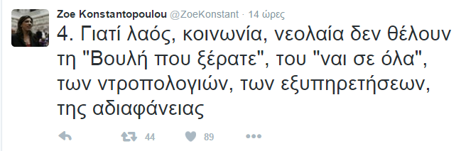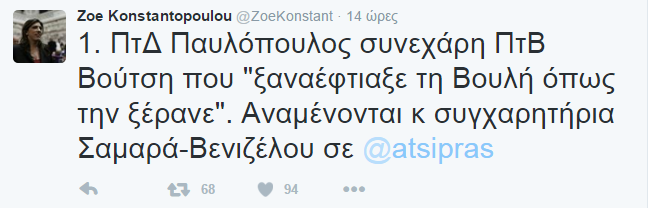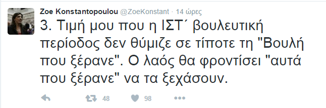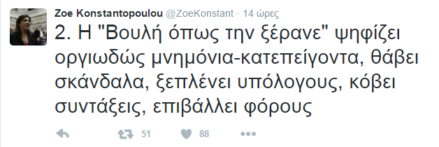 Επίθεση στην κυβέρνηση εξαπέλυσε η πρώην Πρόεδρος της Βουλής Ζωή Κωνσταντοπούλου, με αναρτήσεις που έκανε στον προσωπικό της λογαριασμό στο Twitter, ενώ παράλληλα δήλωσε περήφανη που η βουλή την περίοδο που αυτή ήταν πρόεδρος δεν «θύμιζε σε τίποτα την βουλή που ξέρανε».