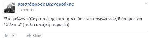 Λίγο νωρίτερα ο κ. Βερναρδάκης είχε γράψει: “Στο μέλλον κάθε ρατσιστής από τη Χίο θα είναι πανελληνίως διάσημος για 15 λεπτά” (παλιά κινεζική παροιμία)”