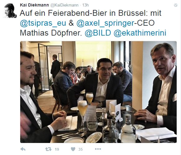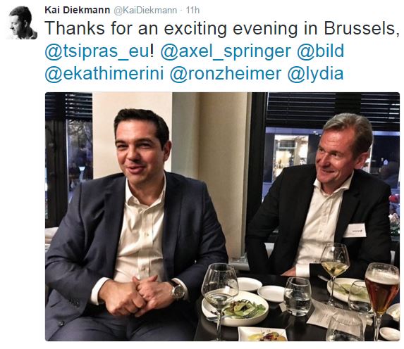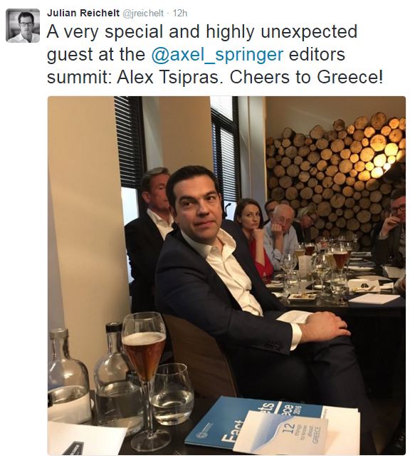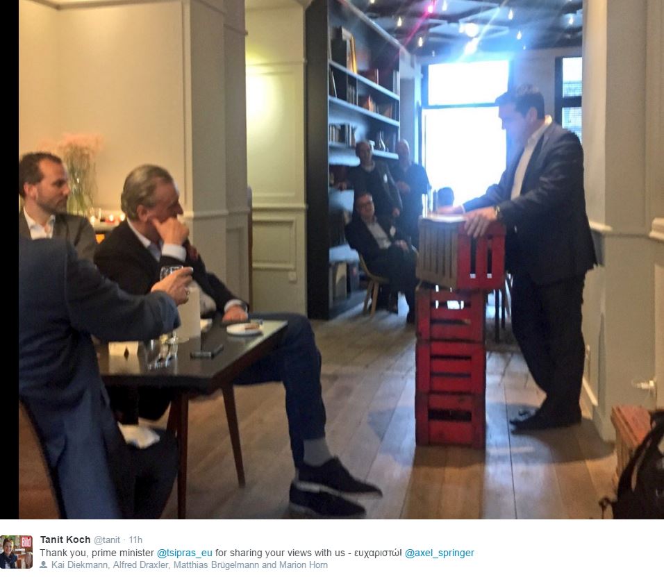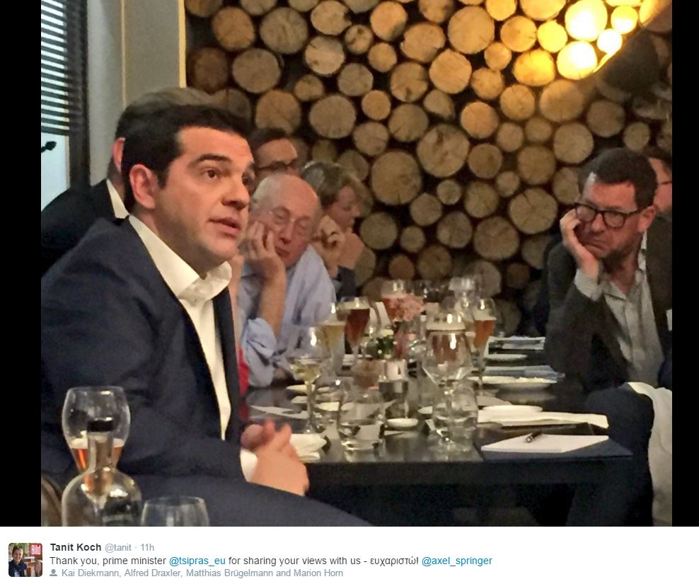 Μαζί με τον CEO του εκδοτικού οίκου «Axel Springer SE», ενός εκ των μεγαλύτερων εκδοτικών συγκροτημάτων στη Γερμανία, στο οποίο ανήκει και η Bild, βρέθηκε ο πρωθυπουργός, Αλέξης Τσίπρας.