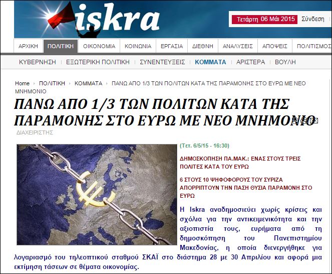 «Πάνω από το 1/3 των πολιτών κατά της παραμονής στο ευρώ με νέο μνημόνιο» είναι ο τίτλος του βασικού θέματος της ιστοσελίδας iskra που απηχεί τις απόψεις της Αριστερής Πλατφόρμας της οποίας ηγείται ο Παναγιώτης Λαφαζάνης.
