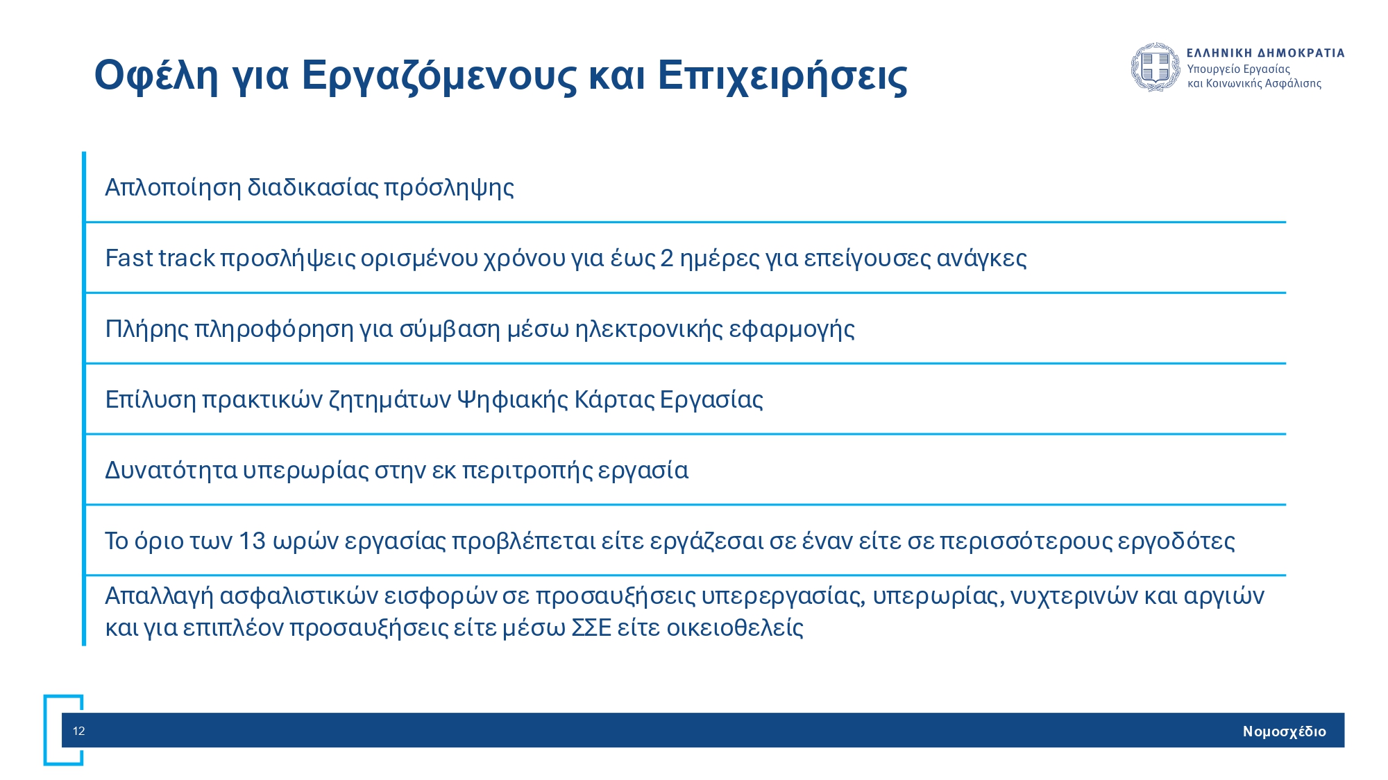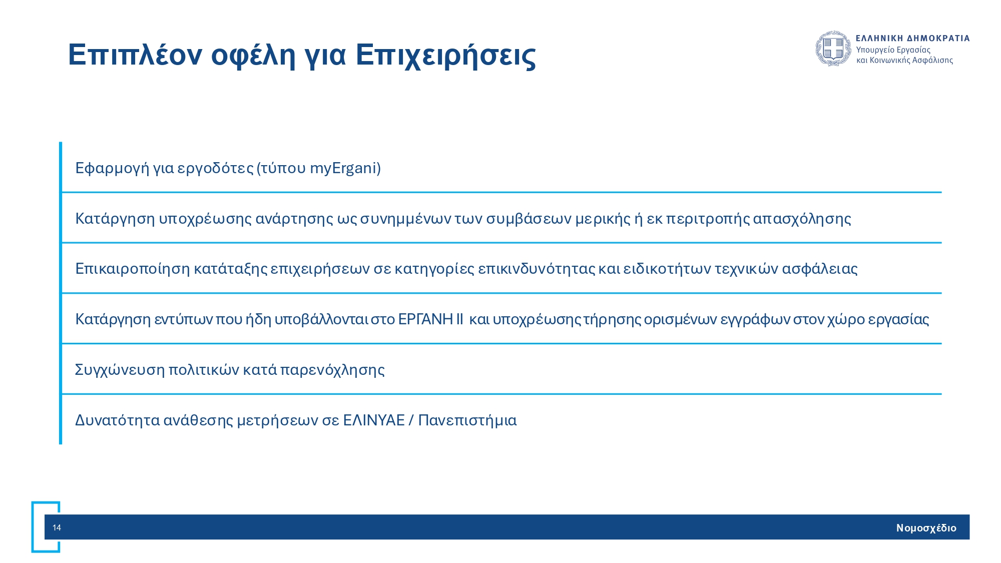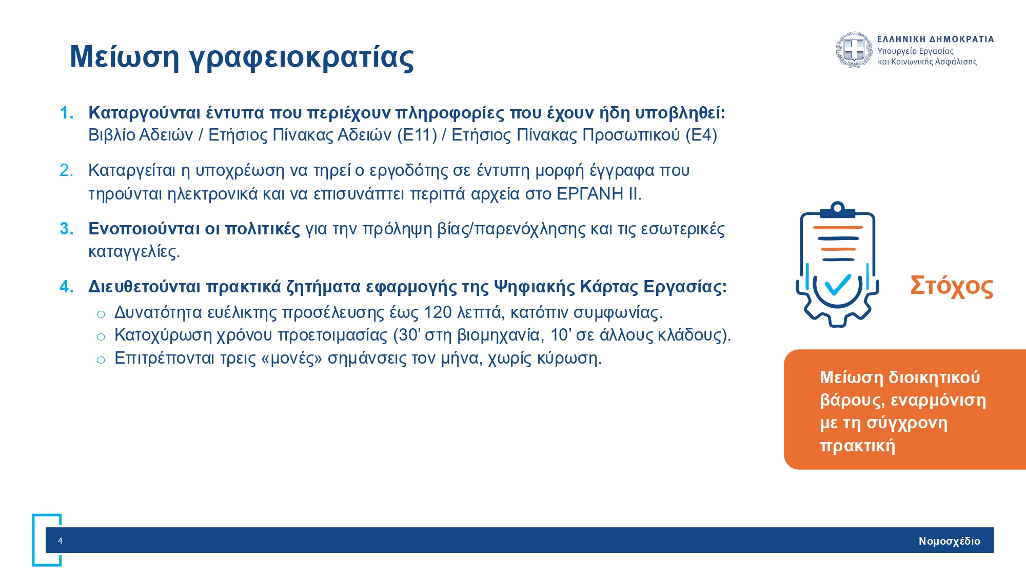 Ως προς το ζήτημα της μείωσης της γραφειοκρατίας το νομοσχέδιο εισάγει την κατάργηση των εντύπων που περιέχουν πληροφορίες που έχουν ήδη υποβληθεί. Ακόμη, καταργείται η υποχρέωση να τηρεί ο εργοδότης σε έντυπη μορφή έγγραφα που τηρούνται ηλεκτρονικά και να επισυνάπτει περιττά αρχεία στο ΕΡΓΑΝΗ ΙΙ. Παράλληλα, ενοποιούνται οι πολιτικές για την πρόληψης βίας/παρενόχλησης και τις εσωτερικές καταγγελίες, ενώ διευθετούνται πρακτικά ζητήματα εφαρμογής της Ψηφιακής Κάρτας Εργασίας.
