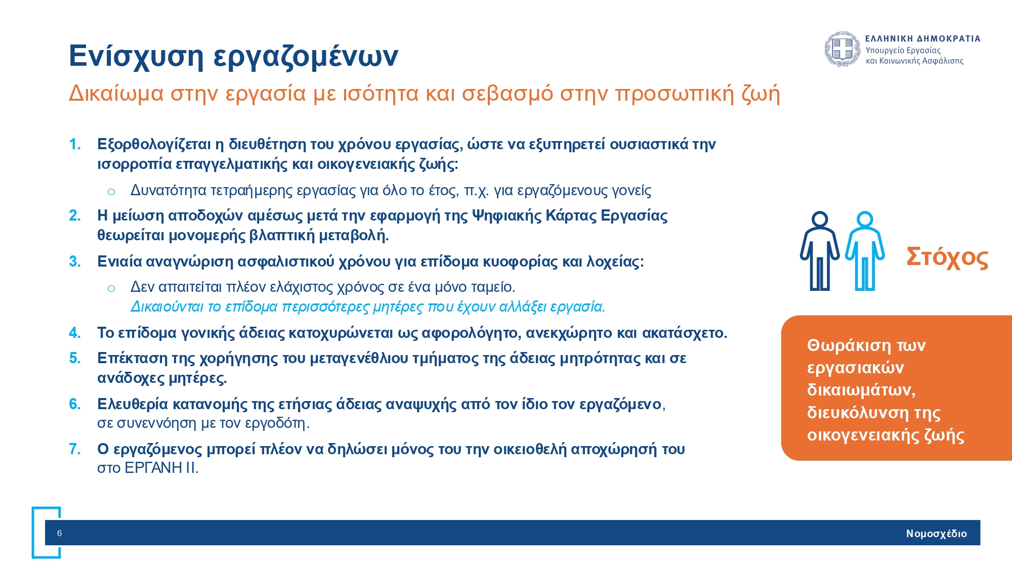 Με το νέο εργασιακό νομοσχέδιο, σύμφωνα με το υπουργείο, θωρακίζονται τα εργασιακά δικαιώματα και διευκολύνεται η οικογενειακή ζωή των εργαζομένων.