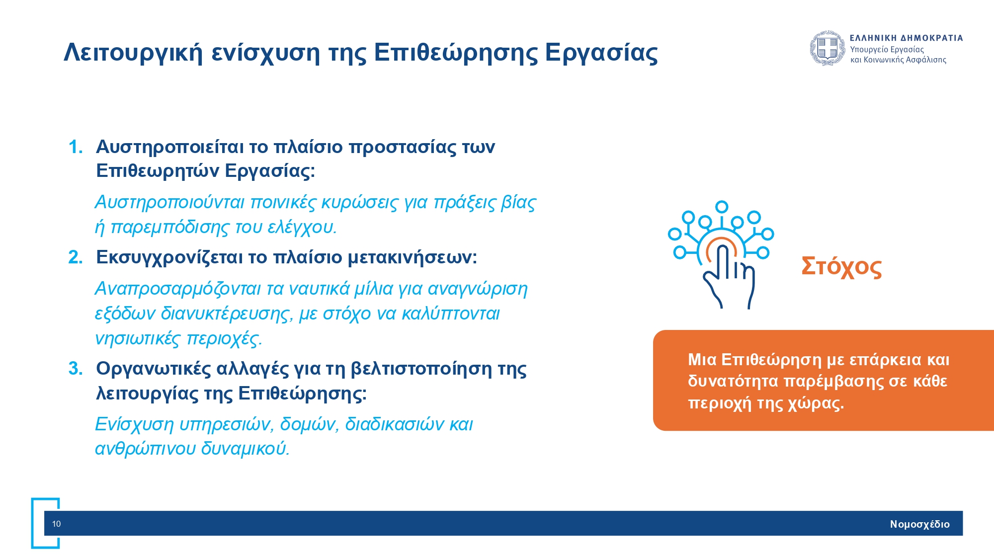 - Αυστηροποιείται το πλαίσιο προστασίας των Επιθεωρητών Εργασίας: Αυστηροποιούνται ποινικές κυρώσεις για πράξεις βίας ή παρεμπόδισης του ελέγχου.