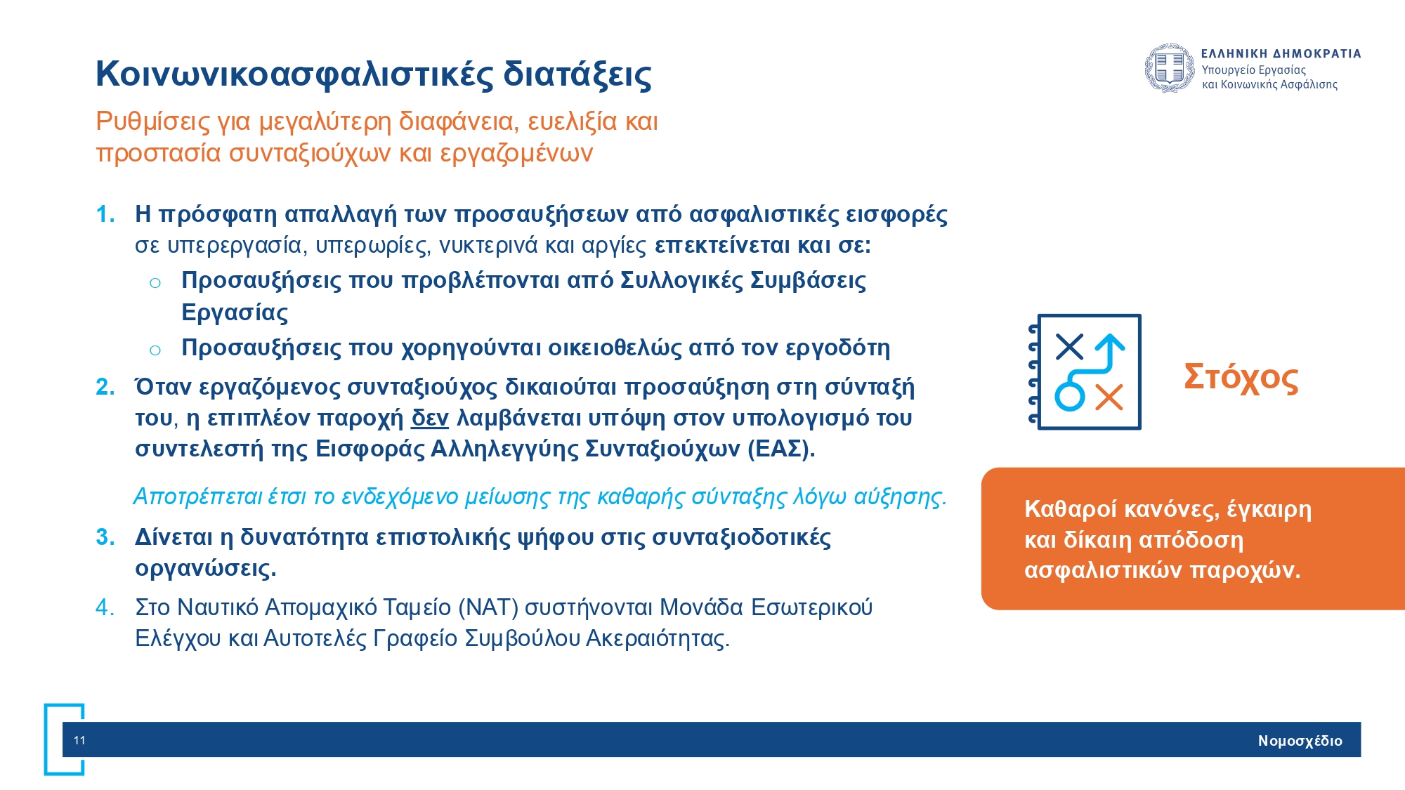 Εισάγονται διατάξεις για μεγαλύτερη διαφάνεια, ευελιξία και προστασία συνταξιούχων και εργαζομένων.