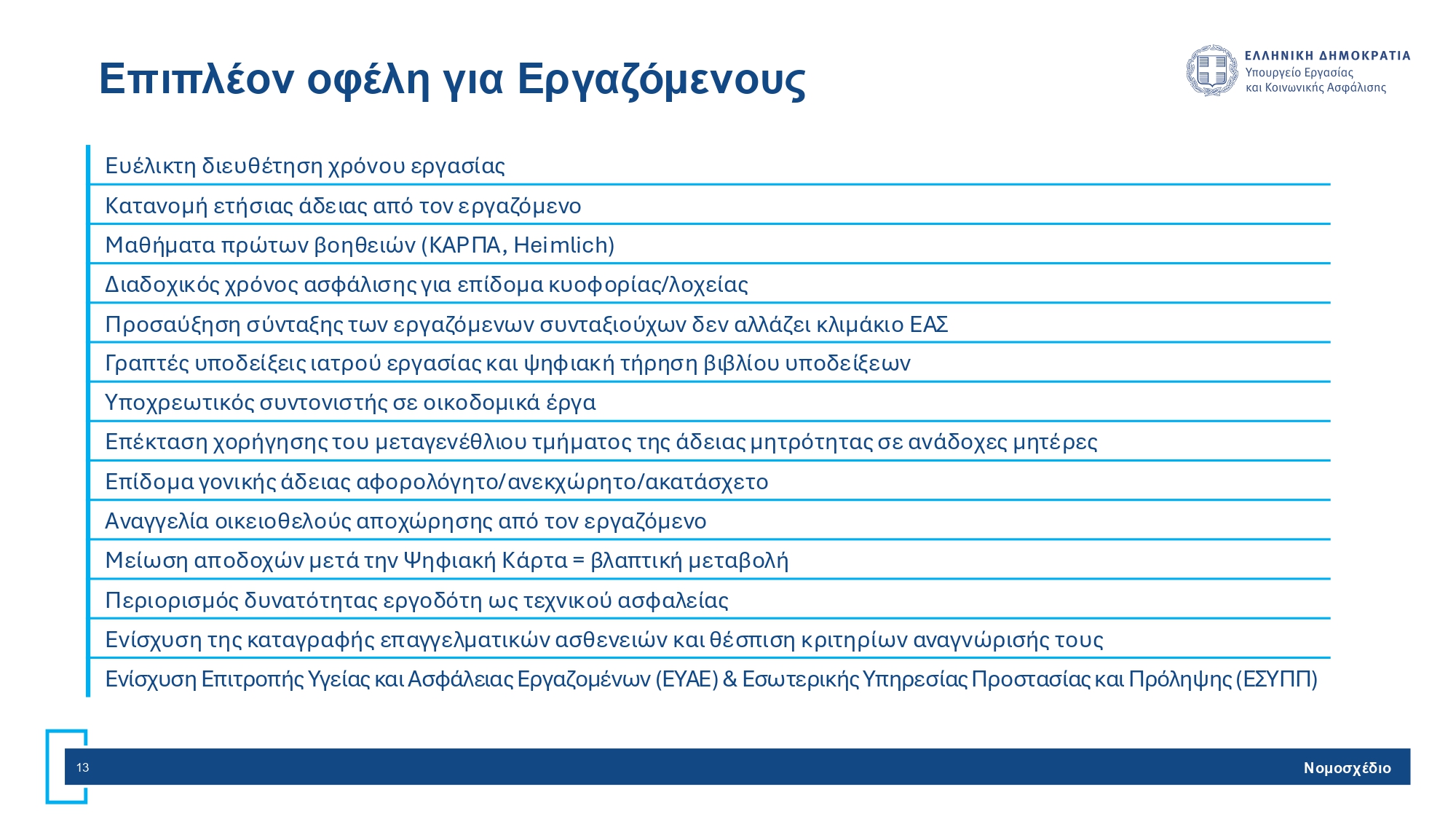 - Ενισχύεται ο ρόλος των Επιτροπών Υγείας και Ασφάλειας Εργαζομένων (ΕΥΑΕ) και των Εσωτερικών Υπηρεσιών Προστασίας και Πρόληψης (ΕΣΥΠΠ).