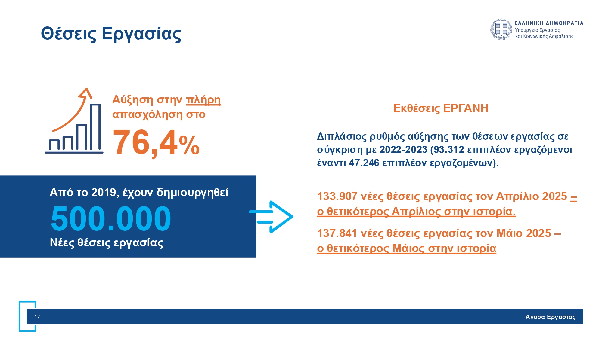 - Από τον Ιούλιο 2019 έως τον Απρίλιο 2025, έχουμε επιτύχει μείωση της ανεργίας των νέων (15-24) κατά 44,3% μέσω στοχευμένων πολιτικών.