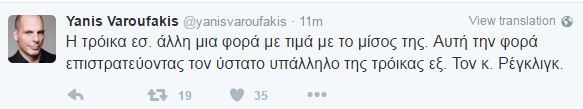 “Η τρόικα εσωτερικού άλλη μια φορά με τιμά με το μίσος της. Αυτή την φορά επιστρατεύοντας τον ύστατο υπάλληλο της τρόικας εξωτερικού. Τον κ. Ρέγκλιγκ.” έγραψε σε νέο tweet ο κ. Βαρουφάκης.