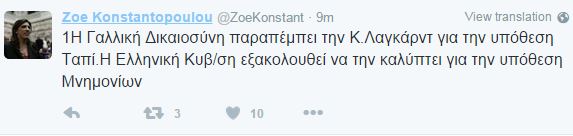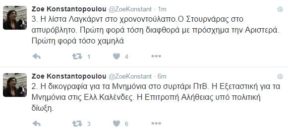 Νέα πυρά στην κυβέρνηση εκτοξεύει μέσω Twitter η Ζωή Κωνσταντοπούλου, με βασικό θέμα τη λίστα Λαγκάρντ και τα μνημόνια.