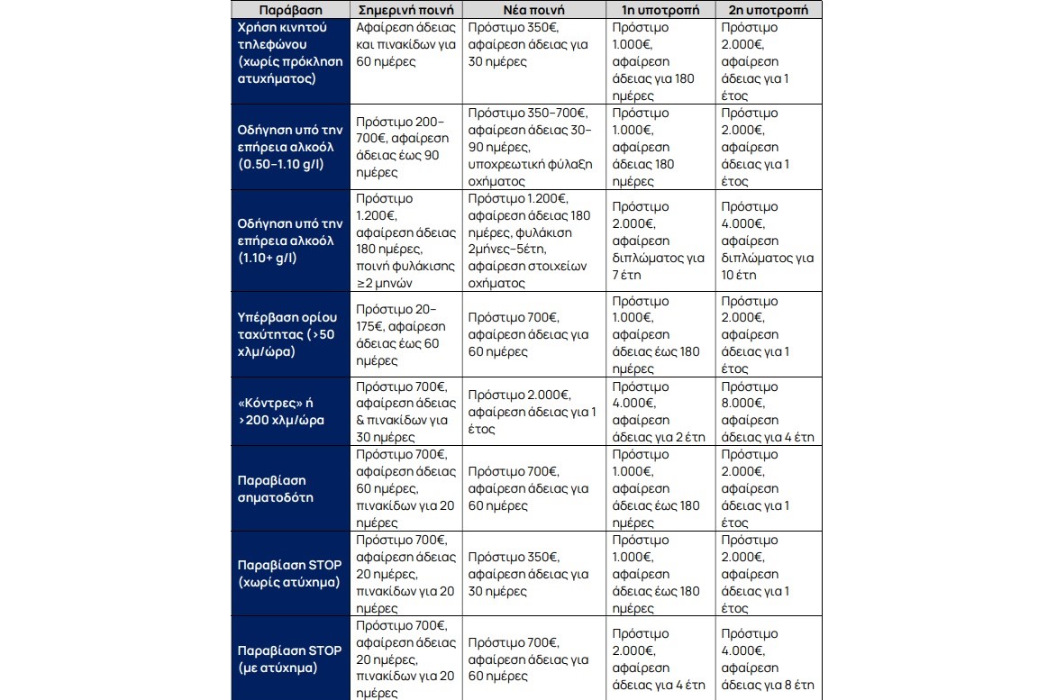 Σημειώνουν, ακόμη, ότι «ενδεικτικό παράδειγμά αυτής της νέας δομής ποινών αποτελεί η αντιμετώπιση της χρήσης κινητού τηλεφώνου, που το 2024 ήταν η 3η αιτία πρόκλησης τροχαίων στην Ελλάδα. Σήμερα, ανεξαρτήτως της πρόκλησης ατυχήματος, η χρήση κινητού επισύρει αφαίρεση άδειας οδήγησης και πινακίδων για 60 ημέρες.