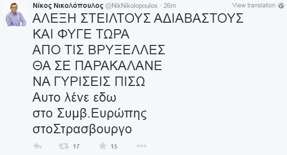 Μήνυμα στον Αλέξη Τσίπρα έστειλε μέσω του προσωπικού του λογαριασμού στο twitter, o Nίκος Νικολόπουλος. Την ώρα που βρίσκονται σε εξέλιξη οι διαπραγματεύσεις στις Βρυξέλλες, ο βουλευτής των Ανεξαρτήτων Ελλήνων έγραψε, απευθυνόμενος στον Πρωθυπουργό: “Αλέξη στείλτους αδιάβαστους και φύγε τώρα από τις Βρυξέλλες. Θα σε παρακαλάνε να γυρίσεις πίσω. Αυτό λένε εδώ στο Συμβούλιο Ευρώπης στο Στρασβούργο.”
