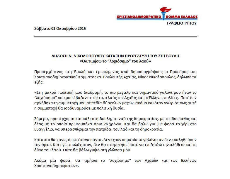 Προσερχόμενος στη Βουλή και ερωτώμενος από δημοσιογράφους, ο Πρόεδρος του Χριστιανοδημοκρατικού Κόμματος και Βουλευτής Αχαΐας, Νίκος Νικολόπουλος, δήλωσε τα εξής:
