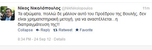 Την απόφαση του προέδρου της Βουλής Βαγγέλη Μεϊμαράκη να αναστείλει τα καθήκοντά του, μετά τις αποκαλύψεις της Real News, σχολίασε πριν από λίγο στο Τwitter ο βουλευτής Αχαϊας Νίκος Νικολόπουλος.”Τα αξιώματα, πολλώ δε μάλλον αυτό του Προέδρου της Βουλής, δεν είναι χρηματιστηριακή μετοχή, για να αναστέλλεται…η διαπραγμάτευση της!”, έγραψε στο Twitter.