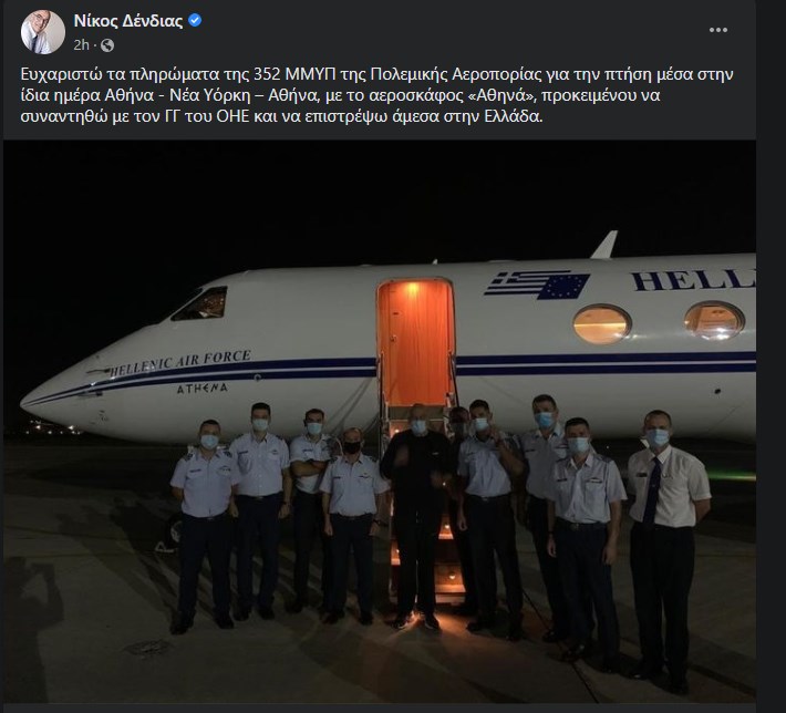 “Ευχαριστώ τα πληρώματα της 352 ΜΜΥΠ της Πολεμικής Αεροπορίας για την πτήση μέσα στην ίδια ημέρα Αθήνα – Νέα Υόρκη – Αθήνα, με το αεροσκάφος «Αθηνά», προκειμένου να συναντηθώ με τον ΓΓ του ΟΗΕ και να επιστρέψω άμεσα στην Ελλάδα” έγραψε ο υπουργός Εξωτερικών, Νίκος Δένδιας, στους λογαριασμούς του στα social media.