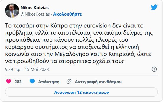 «Το τεσσάρι στην Κύπρο στην Eurovision δεν είναι το πρόβλημα, αλλά το αποτέλεσμα, ακόμη ένα δείγμα, της προσπάθειας που κάνουν πολλές πλευρές του κυρίαρχου συστήματος να αποξενωθεί η ελληνική κοινωνία από την Μεγαλόνησο και το Κυπριακό, ώστε να προωθηθούν τα απορριπτέα σχέδιά τους» έγραψε σε ανάρτησή του στα social media ο Νίκος Κοτζιάς και το Twitter πήρε «φωτιά».