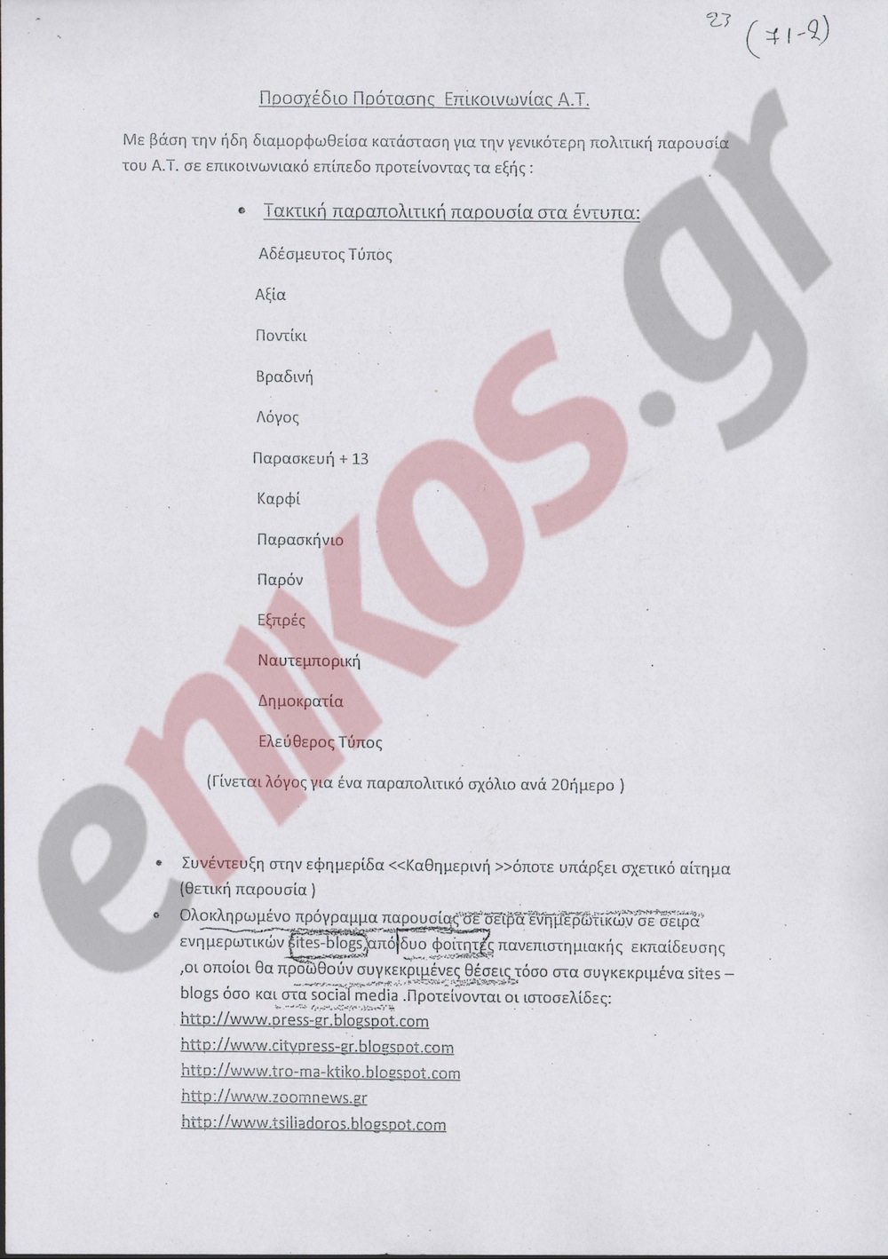 Πρόκειται ενδεχομένως για ένα έγγραφο με τίτλο ένα «Προσχέδιο πρότασης επικοινωνίας Α.Τ.», που επίσης βρέθηκε στο αρχείο του, παρότι δεν αναφέρεται το όνομα «Νίκος» σε αυτό.