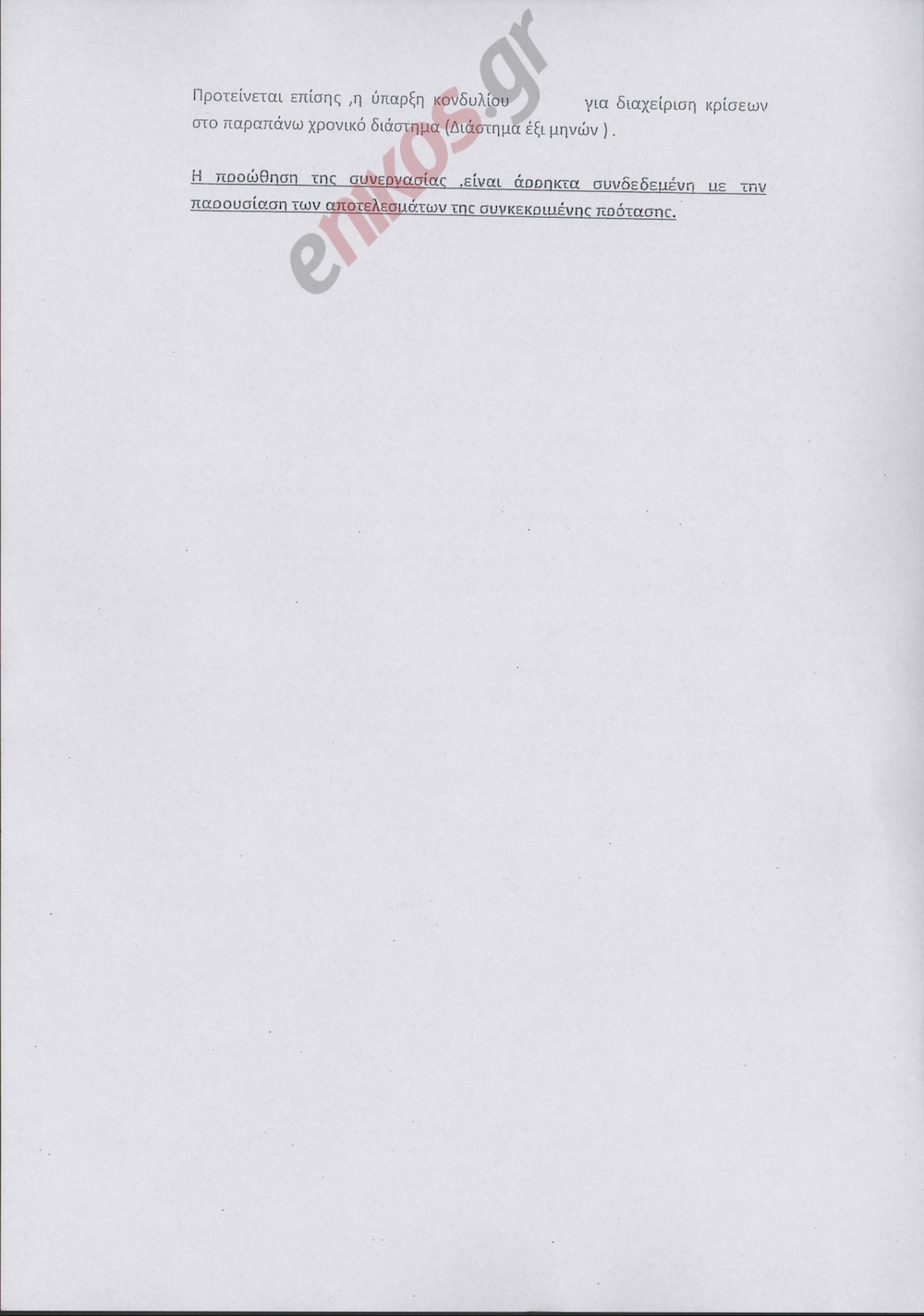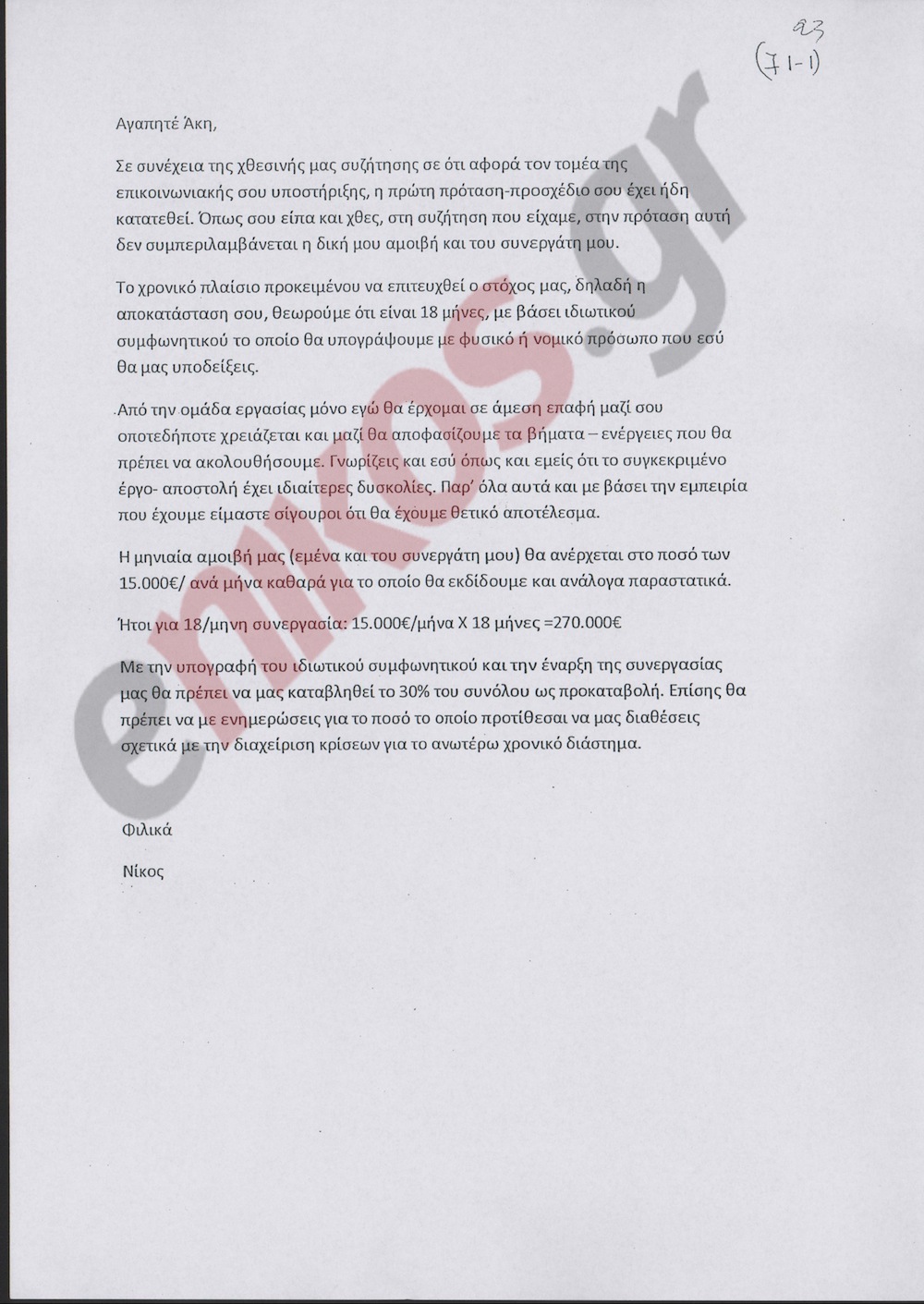 Λεπτομέρεια που παρατηρεί κανείς…:  «Με την υπογραφή του ιδιωτικού συμφωνητικού και την έναρξη της συνεργασίας μας», αναφέρεται, «θα πρέπει να μας καταβληθεί το 30% του συνόλου ως προκαταβολή. Επίσης θα πρέπει να με ενημερώσεις για το ποσό το οποίο προτίθεται να μας διαθέσεις σχετικά με τη διαχείριση κρίσεων για το ανωτέρω χρονικό διάστημα».Ο «Νίκος» τονίζει στην επιστολή του ότι από την ομάδα εργασίας μόνο εκείνος θα έρχεται σε άμεση επαφή με τον ίδιο. «Γνωρίζεις και εσύ όπως και εμείς ότι το συγκεκριμένο έργο-αποστολή έχει ιδιαίτερες δυσκολίες. Παρ’όλα αυτά και με βάσει την εμπειρία που έχουμε είμαστε σίγουροι ότι θα  έχουμε θετικό αποτέλεσμα».Ο «Νίκος» ξεκινά την συγκεκριμένη επιστολή, αναφερόμενος σε μία πρώτη πρόταση – προσχέδιο που «σου έχει ήδη κατατεθεί».