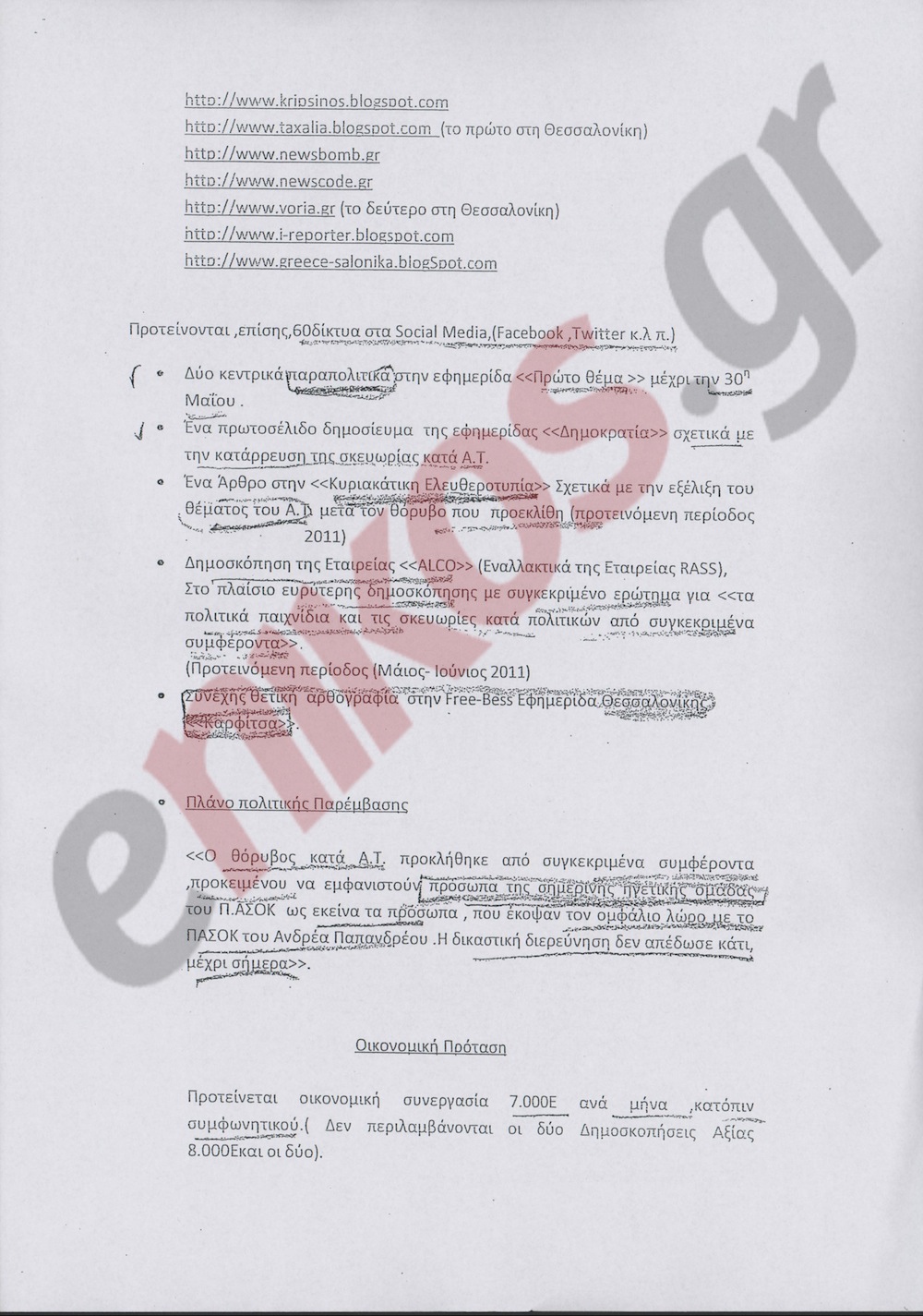 «Ο θόρυβος κατά Α.Τ. προκλήθηκε από συγκεκριμένα συμφέροντα προκειμένου να εμφανιστούν πρόσωπα της σημερινής ηγετικής ομάδας του ΠΑΣΟΚ ως εκείνα τα πρόσωπα που έκοψαν τον ομφάλιο λώρο με το ΠΑΣΟΚ του Ανδρέα Παπανδρέου. Η δικαστική διερεύνηση δεν απέδωσε κάτι μέχρι σήμερα».Μάλιστα, στο συγκεκριμένο έγγραφο η οικονομική συνεργασία που προτείνεται στον κ. Τσοχατζόπουλο είναι έναντι αμοιβής που φτάνει τα 7.000 ευρώ το μήνα, με την υποσημείωση ότι σε αυτή την τιμή δεν περιλαμβάνονται οι δύο δημοσκοπήσεις αξίας 8.000 ευρώ και οι δύο.  Στα ντοκουμέντα που ακολουθούν διαβάστε αναλυτικά το σχέδιο που πρότεινε ο “Νίκος” στον “Άκη” για να αποκαταστήσει τη δημόσια εικόνα του.