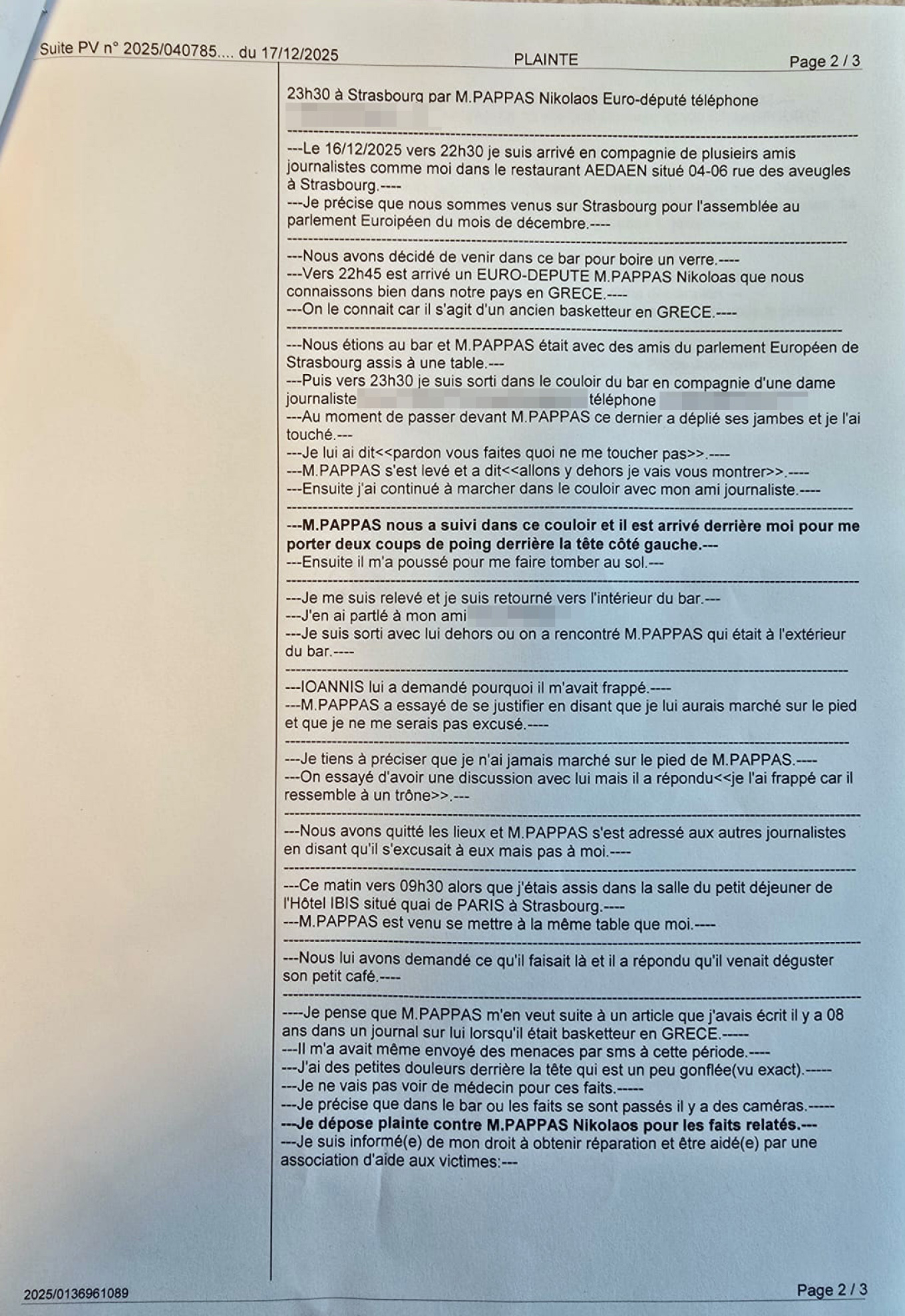 Την Τετάρτη 17 Δεκεμβρίου, ο Νίκος Γιαννόπουλος υπέβαλε μήνυση στην Αστυνομική Διοίκηση Αλσατίας, που εδρεύει στο Στρασβούργο, και περιέγραψε αναλυτικά το περιστατικό στον αστυνομικό, που του πήρε κατάθεση. Ο ευρωβουλευτής κατηγορείται για άσκηση βίας από εκπρόσωπο σε θεσμικό ρόλο σε ήρεμη ψυχική κατάσταση. Έως το βράδυ της Τετάρτης ο Νίκος Παππάς αναζητείται στο πλαίσιο του αυτοφώρου, κάτι που δεν καλύπτεται από την ασυλία του.