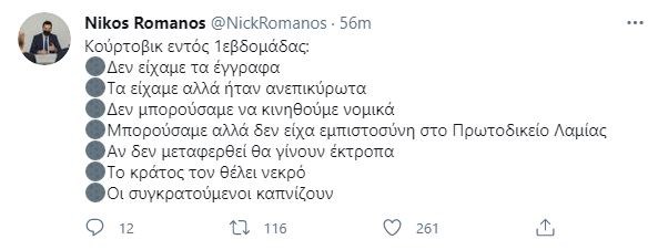 Μια ανάρτηση για την υπόθεση του Δημήτρη Κουφοντίνα και τα όσα έχει ισχυριστεί η συνήγορος υπεράσπισής του, Ιωάννα Κούρτοβικ έκανε ο διευθυντής του γραφείου Τύπου της ΝΔ, Νίκος Ρωμανός. Στον προσωπικό λογαριασμό του στο Twitter αναφέρει αναλυτικά όσα έχει ισχυριστεί η κα Κούρτοβικ σε διάστημα μίας εβδομάδας για τον απεργό πείνας, Δημήτρη Κουφοντίνα και για τους λόγους που δεν προσέφυγε στη Δικαιοσύνη. Αναλυτικά γράφει:
